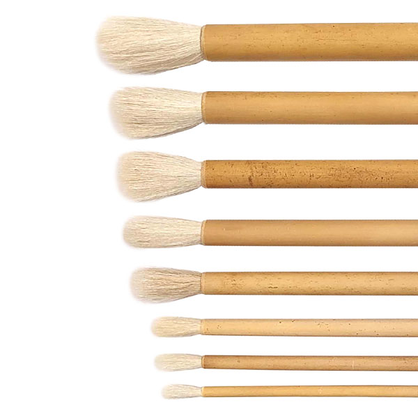 山羊毛・・・・・水含み、毛のまとまりが良く、毛の消耗度が低い。復元性に特徴があり、腰の強いものと軟らかいものがある。 ダミ筆や刷毛の材料として使われることが多い。