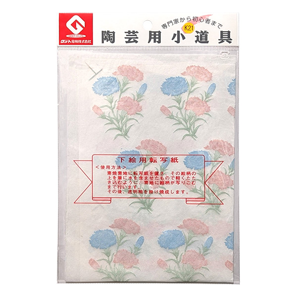 絵柄・デザインは版権等の諸事情により、変更またはご要望にお答えできない場合があります。大きさ・絵柄・ピース数には多少の変動がありますので、ご了承ください。素焼き素地に転写紙を置き、その絵柄の上をダミ筆に水を含ませたもので軽く叩き込みように素地に絵柄が刷り込むまで行います。その後、透明釉を掛け焼成します。