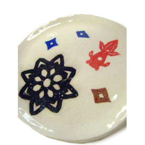素焼素地に転写紙を置き、その絵柄の上を筆に水を含ませたもので軽くたたき込むように、素地に絵柄が写りこむまで行います。その後、透明釉を掛け焼成します。
