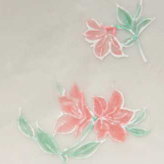 花の絵柄の輪郭部分を盛り上げ厚みのある線と、中側には色々の絵具を配色した転写紙です。