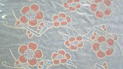 花の絵柄の輪郭部分を盛り上げ厚みのある線と、中側には色々の絵具を配色した転写紙です。