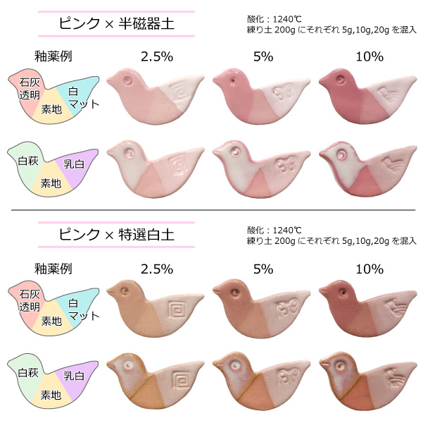 1.使用する粘土に対して重量比で3~10%の練り込み絵具を用意します。混ぜ込んだ時の生地では分かりづらいですが、5%程度で十分な発色をします。薄いとなかなか発色しませんのでグリーンと黒は10%加えるようにして下さい。また素焼きの時と透明釉を掛けて本焼きしたときでは、本焼き後の方が濃くかんじられます。