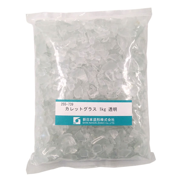 透明の色ガラス片で、使用済のビンを粉砕したリサイクル商品です。作品の底の部分にしきつめて焼成すると水たまりのような効果が得られます。