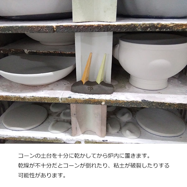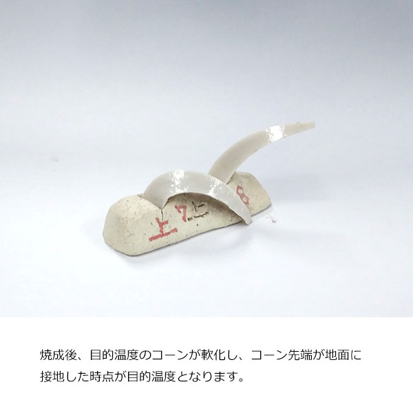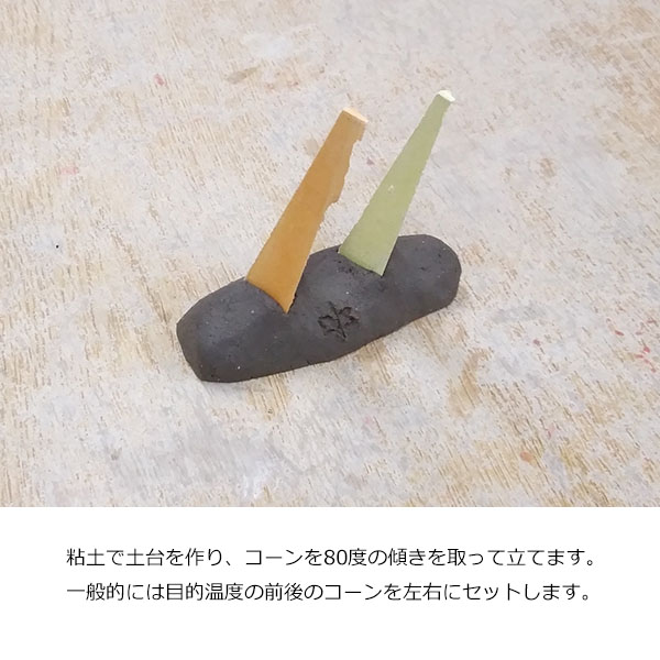 炉内の熱量を測るために使用されます。目的温度と前後のゼーゲルコーン3本を用意することが一般的とされ、熔倒を見ることでより綿密な温度測定が可能になります。