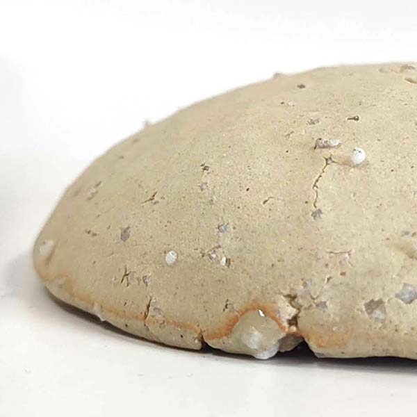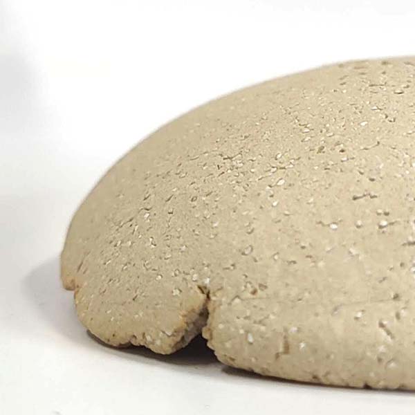 硅砂を混ぜた土の表面には、大き目の粒が見えます。粘土の中に埋まっているものは半透明の粒に、表面に出てきているものはツヤがあり丸くて白い粒状になっています。硅砂はガラスの原料となる成分なので、焼くとツヤが出ます。粒の周りは薄いヒビがでています。