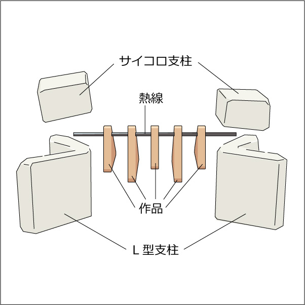 今回の焼成テストでは、L型支柱(45mm)を左右に立て、熱線を乗せて上からサイコロ支柱(30×25×20mm)で押さえました。