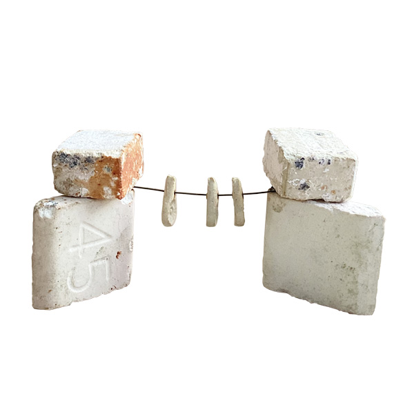 穴を開けた作品3~5個を熱線に均等に吊るして焼成します。