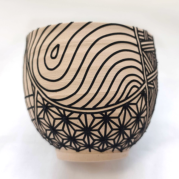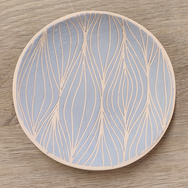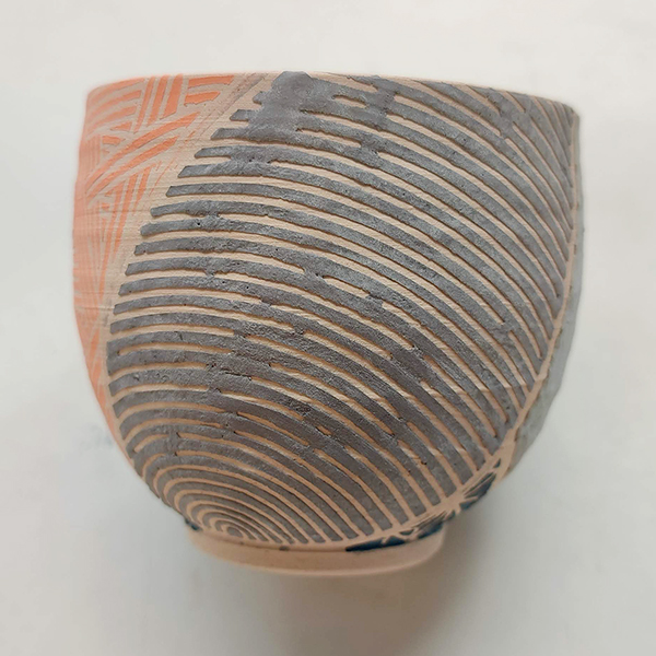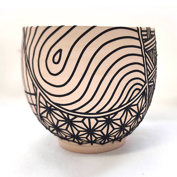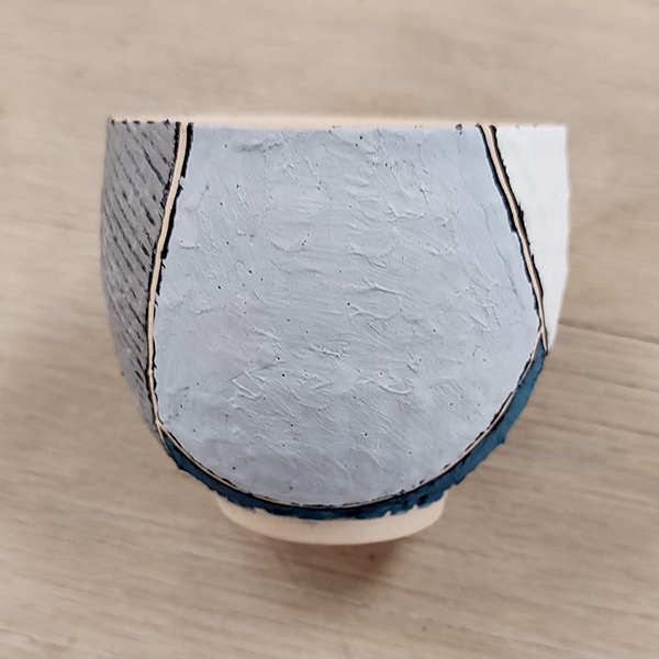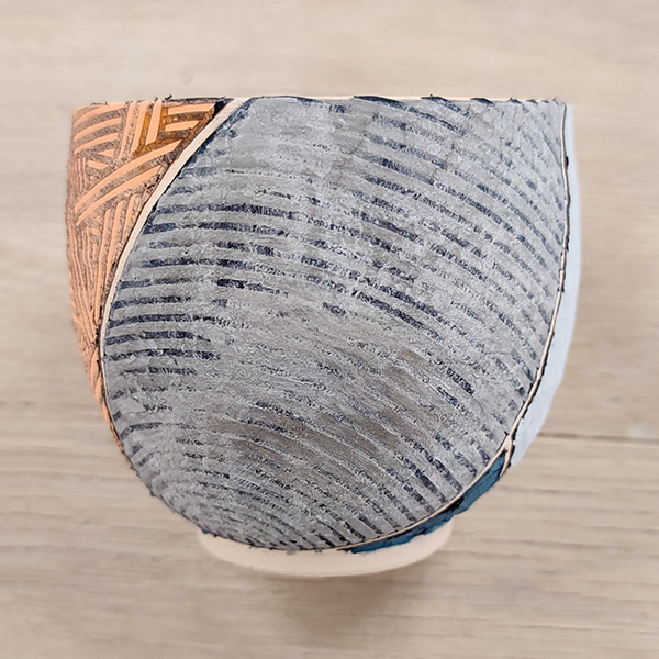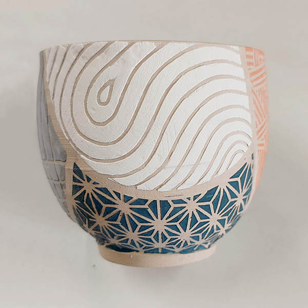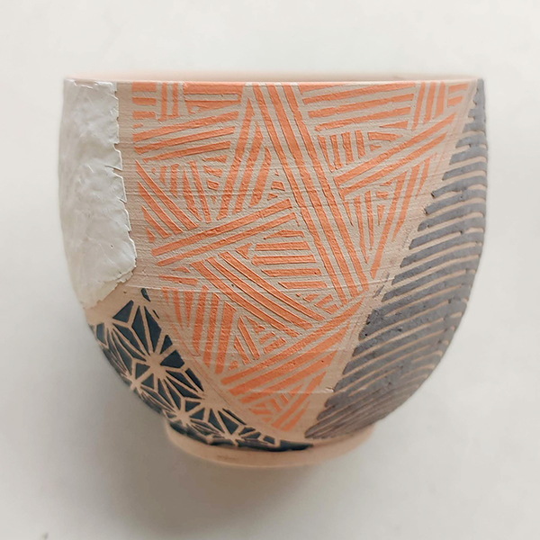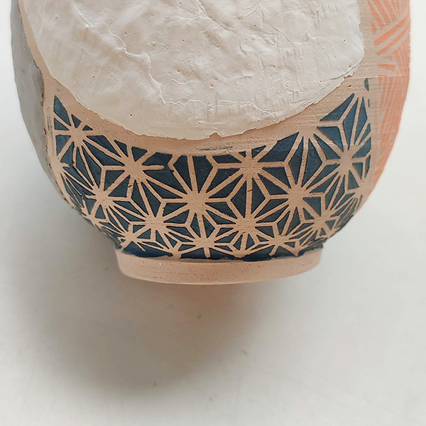 テープの上に化粧や釉を厚くかけていたので、素焼き後も模様が埋まったままになっていましたが、表面をやすりがけすることで模様が浮き出てきました。