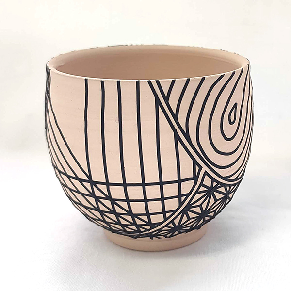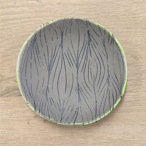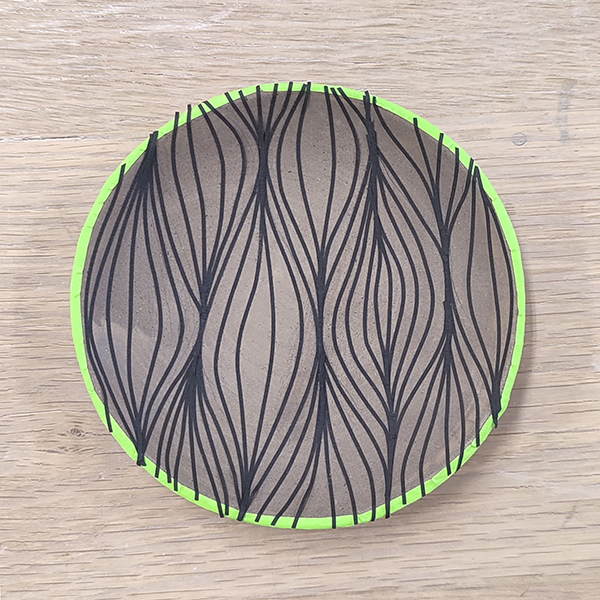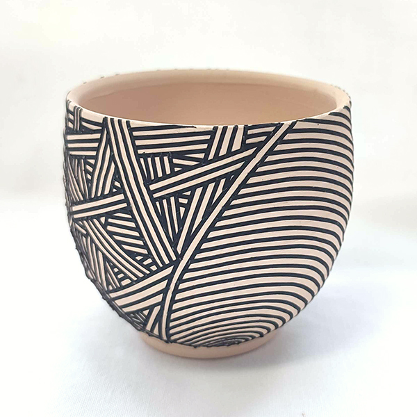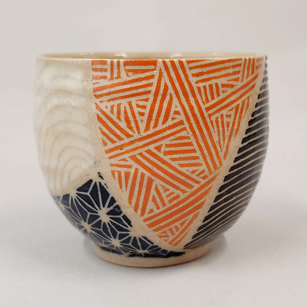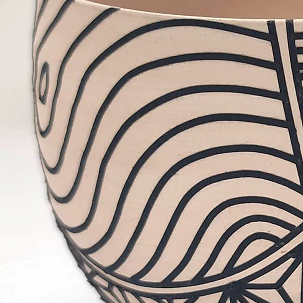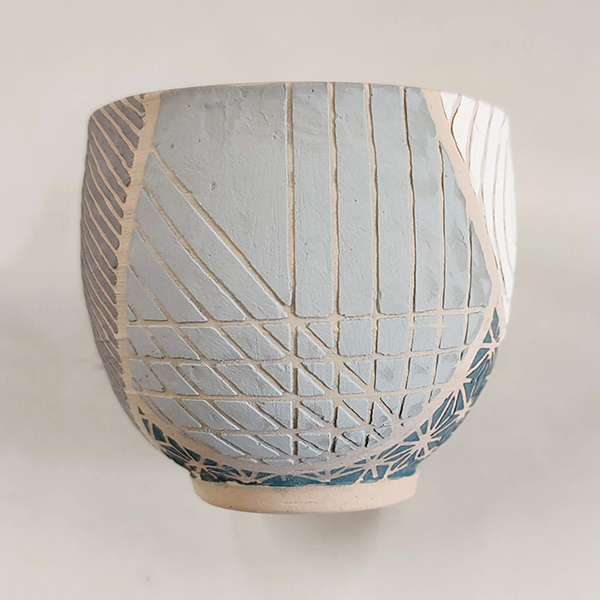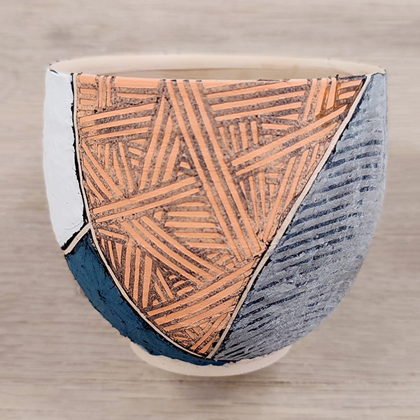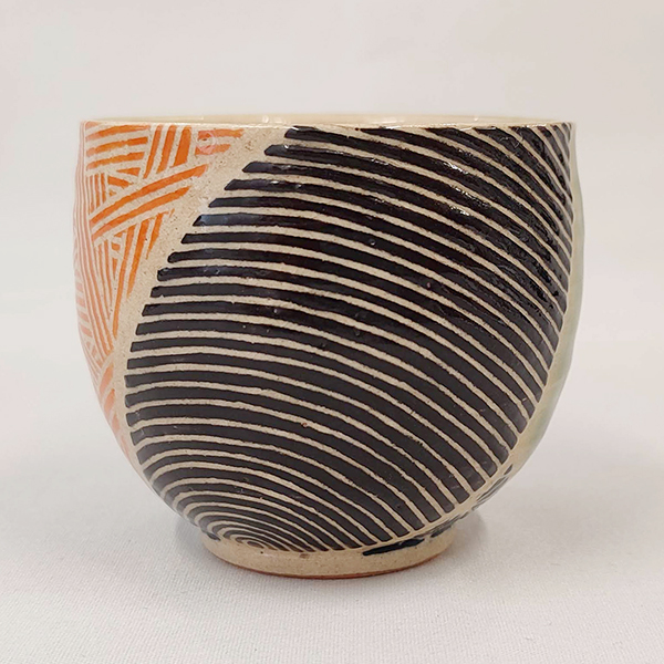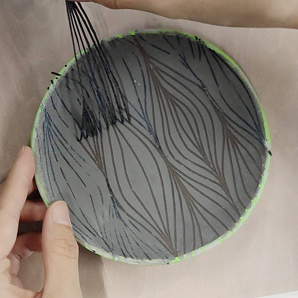 テープの上に化粧や釉を厚くかけていたので、素焼き後も模様が埋まったままになっていましたが、表面をやすりがけすることで模様が浮き出てきました。