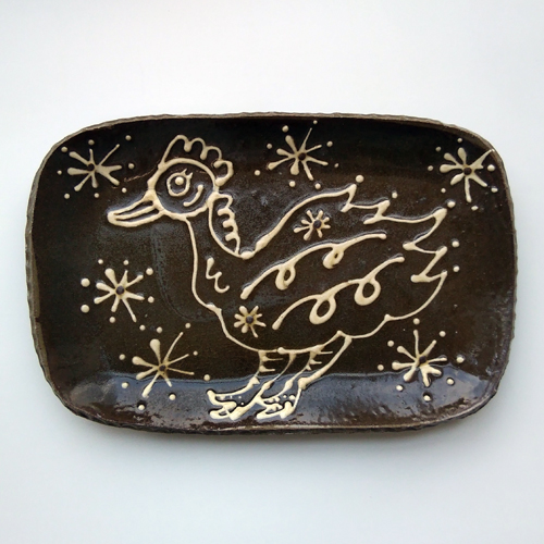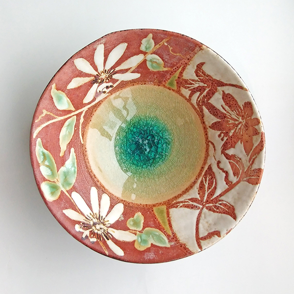 ・削り落としの技法の一種で素地と化粧泥の色の差で図柄を浮き上がらせます。