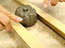 タタラに沿って切り針金を動かし、半分にカットします。一人では難しいので誰かに抑えていてもらいましょう!